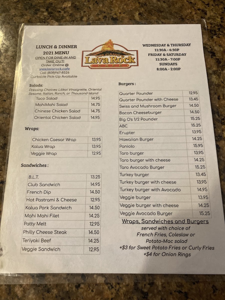 Introducing the menu at Volcano's Lava Rock Cafe is a delightful journey for the senses, perfectly complementing your experience at Hawaii Volcanoes National Park. Nestled in the heart of Volcano, HI, this eatery offers a family-friendly atmosphere adorned with a unique lava-inspired floor that adds charm to your dining affair.
